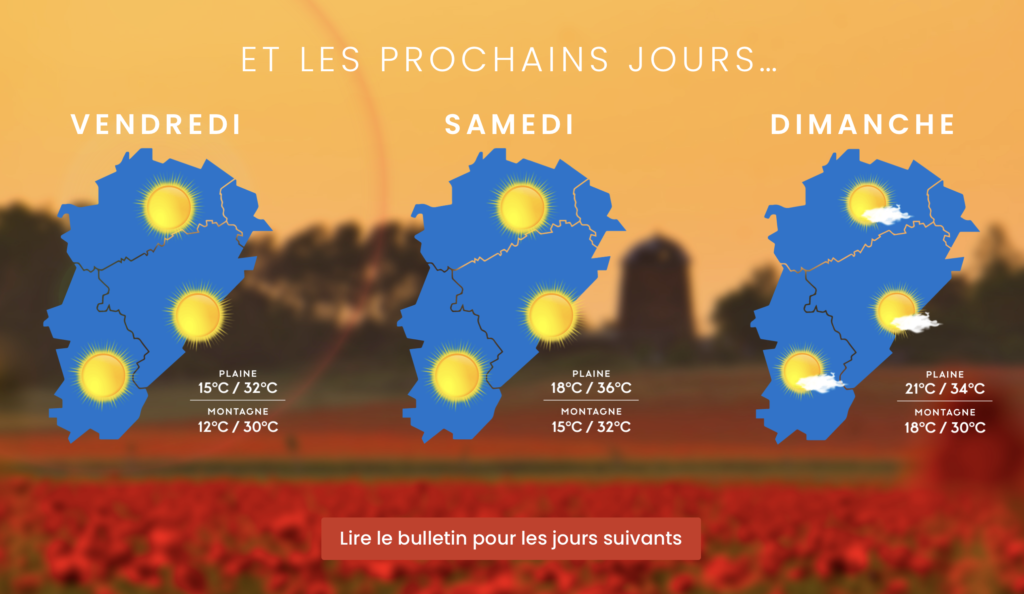 L’Ă©pisode caniculaire dĂ©bute en Franche-ComtĂ© ce Vendredi 17 juin et prendra fin le Mercredi 22 prochain. Le « pic » interviendra dĂ©jĂ samedi et dimanche… Voici Ă quoi il faut s’attendre chaque après-midi :