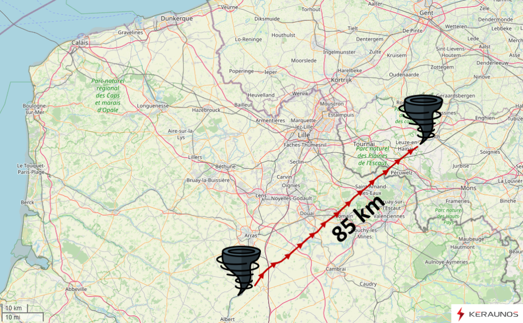 Si des tornades bien plus violentes ont déjà frappé le territoire français par le passé (consulter la liste), celle survenue le 23 octobre 2022 — dans le nord de la France — présente un caractère totalement inédit en France : la distance parcourue.