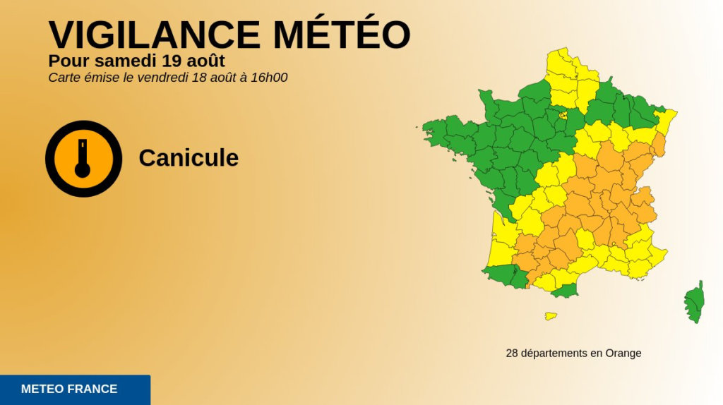 Ainsi, on compte 28 dĂ©partements de France MĂ©tropolitaine placĂ©s en vigilance orange « canicule » ce samedi et pour (encore) cinq jours ! Fin de l’Ă©pisode caniculaire, le jeudi 24 aoĂ»t 2023 au matin.