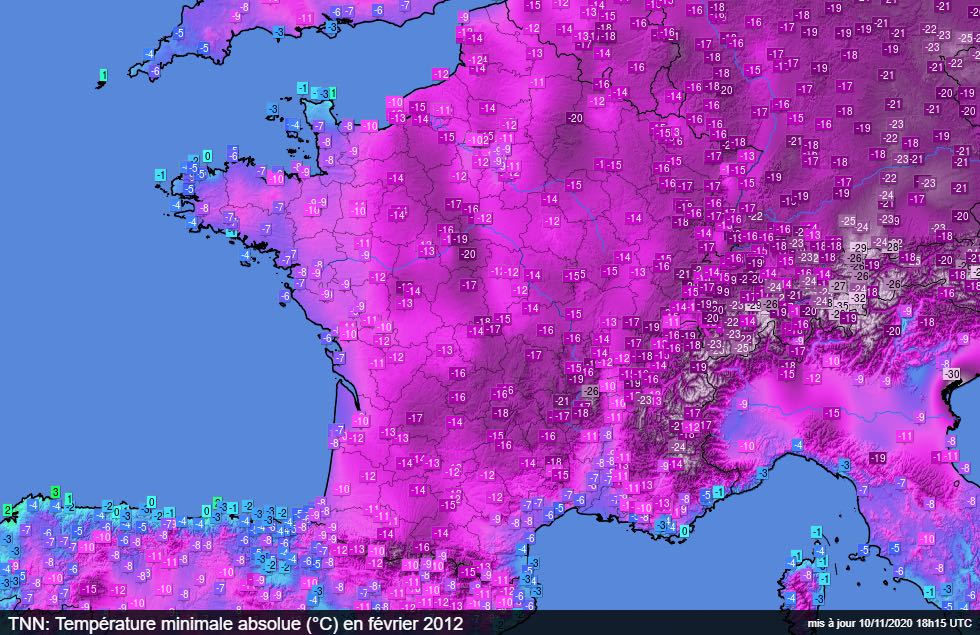 - Dans le Jura, les températures passent sous 0°C pendant 13 jours et nuits à Dole (39) et Lons-le-Saunier (39) ! Ces villes enregistrent (respectivement) des pics à -12,7 et -13,9°C les 05 et 06 Février, mais également huit autres nuits sous les -10°C… Dans le Haut-Jura, les minimales plongent même entre -15 et -30°C pendant ces nuits (manque de données) et peut-être même -45°C* dans la Combe Noire (*estimation) !
