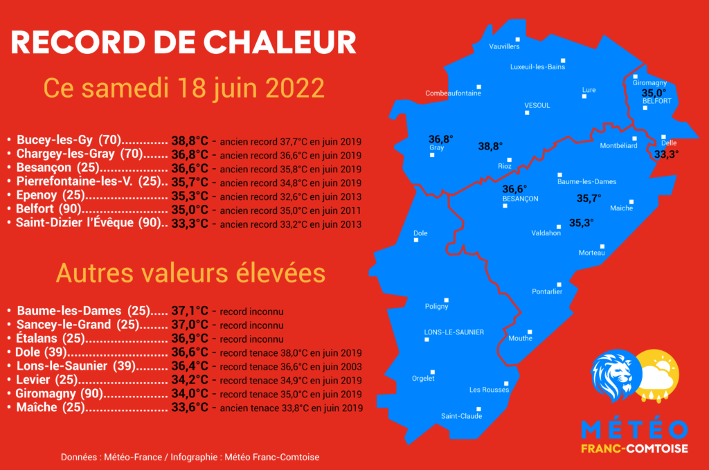 C’est la tempĂ©rature maximale relevĂ©e par la station de MĂ©tĂ©o-France Ă Besançon (25), ce samedi 18 juin 2022… Du jamais en juin, alors que la station – implantĂ©e Ă l’Observatoire de La Bouloie – est en place depuis 1884 (il y a 138 ans) !