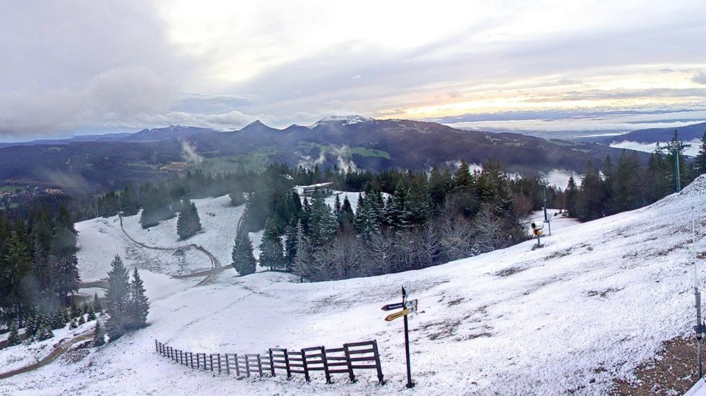 Conformément aux prévisions du jour, un saupoudrage au sol était présent au lever du jour au-dessus de 1300m d’altitude avec parfois 3-4cm sur les hauts sommets ! Des centimètres qui fondent vite…