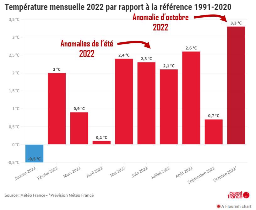 « Le plus remarquable, c’est que l’anomalie thermique enregistrée en octobre, est largement supérieure aux mois de l’été 2022 qui ont pourtant enregistré trois épisodes caniculaires exceptionnels. »