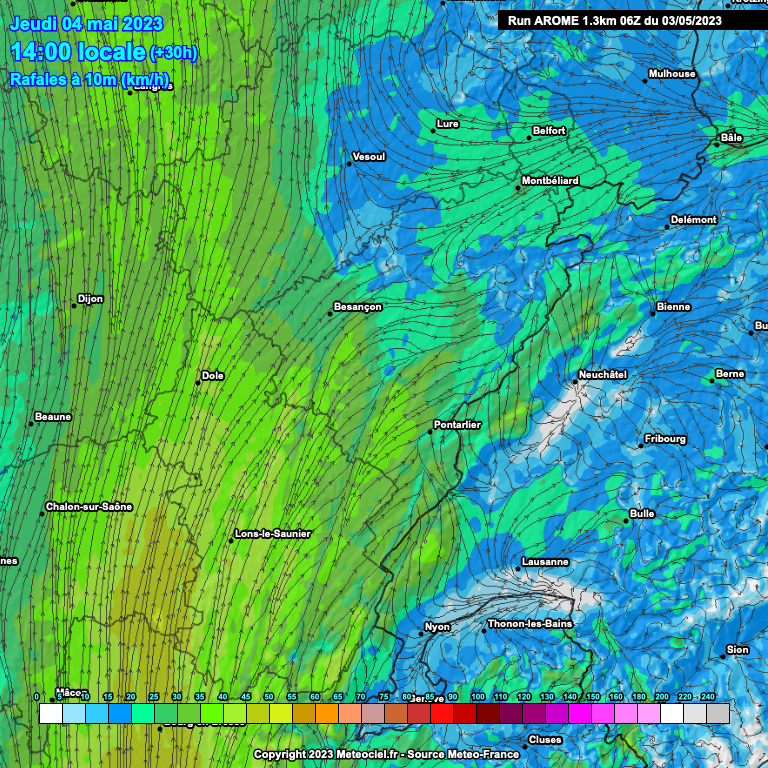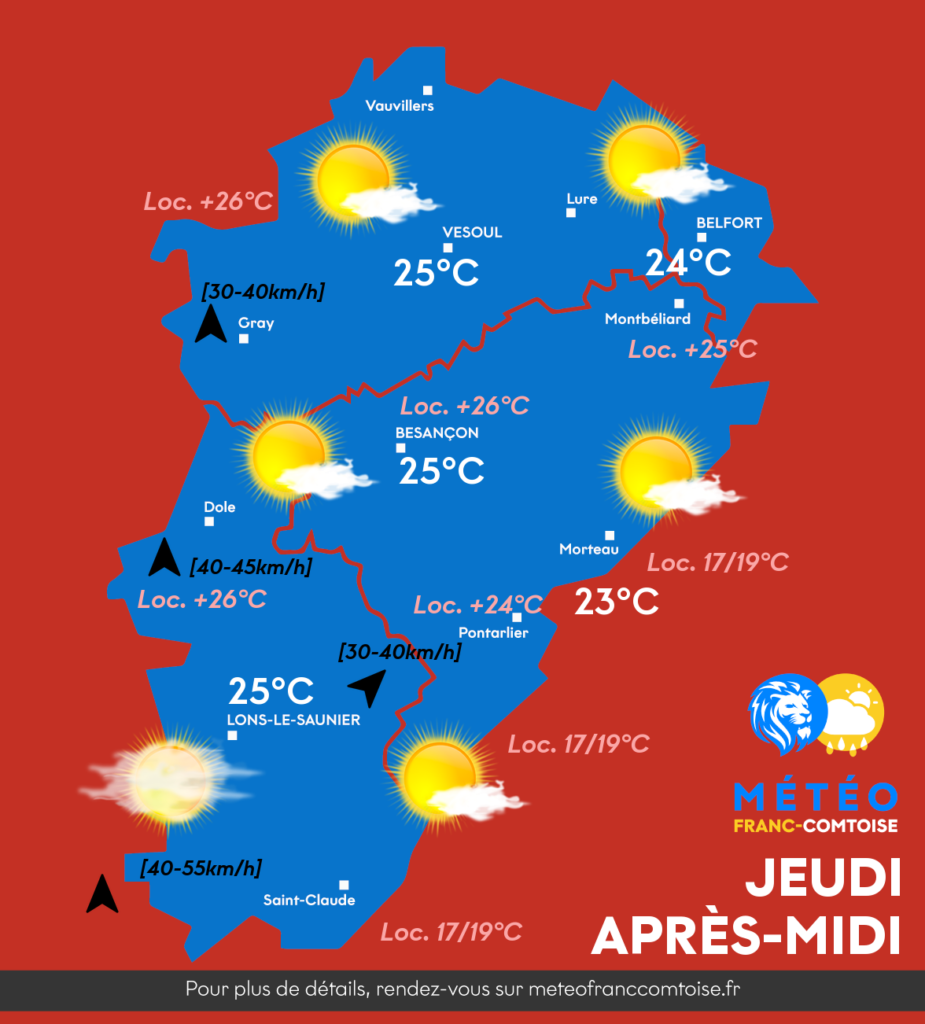 « Ce vent chaud soufflera en rafales à 40 voire 50-55km/h dans le Jura, tandis qu’il restera quasi-absent en direction de Lure, Belfort, Montbéliard ainsi qu’à Maîche. »