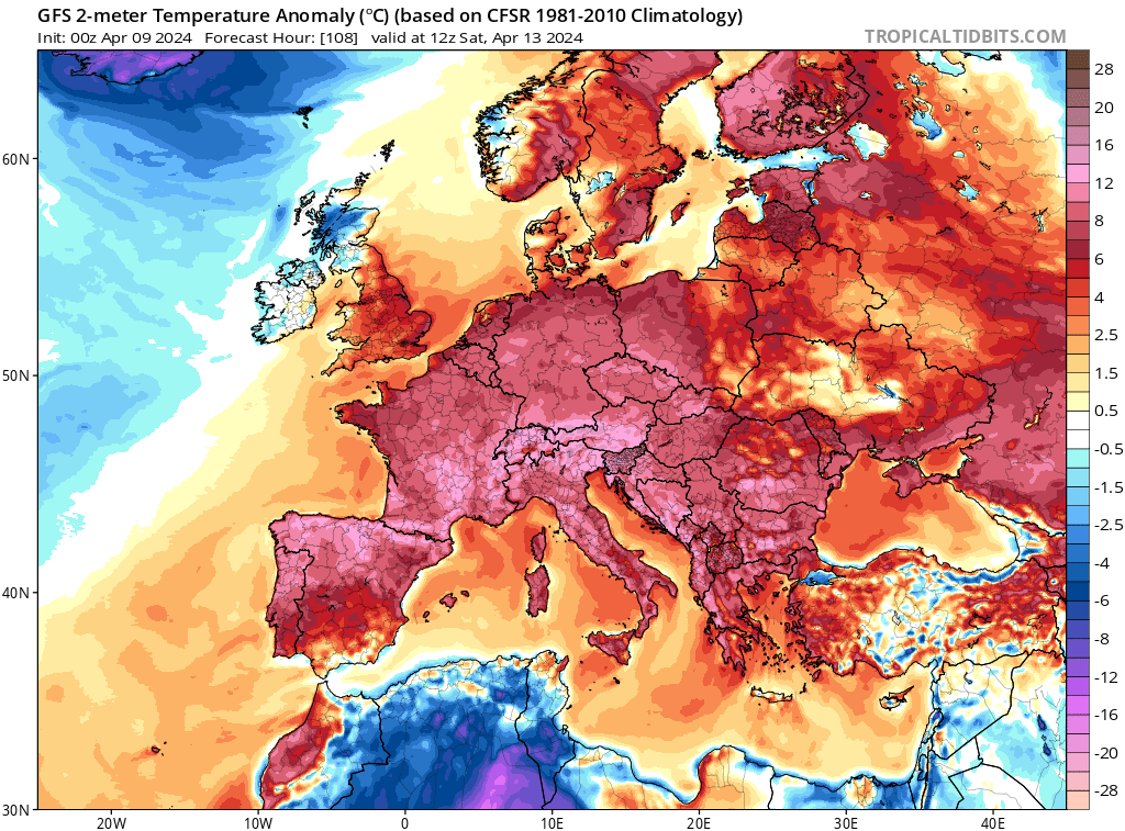 La journée du samedi 13 avril 2024 s’annonce comme étant la plus belle de la semaine avec un beau ciel bleu et un flux qui basculera plein SUD-OUEST sans souffler. L’air chaud en provenance des Îles Canaries atteindra son paroxysme et toute la France sera concernée. Nous relèverons ainsi :