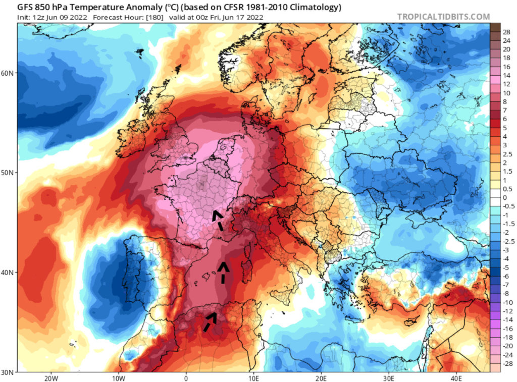 En image – L’arrivée de l’air chaud vendredi avec ici, l’anomalie de T° à 1500m d’altitude.