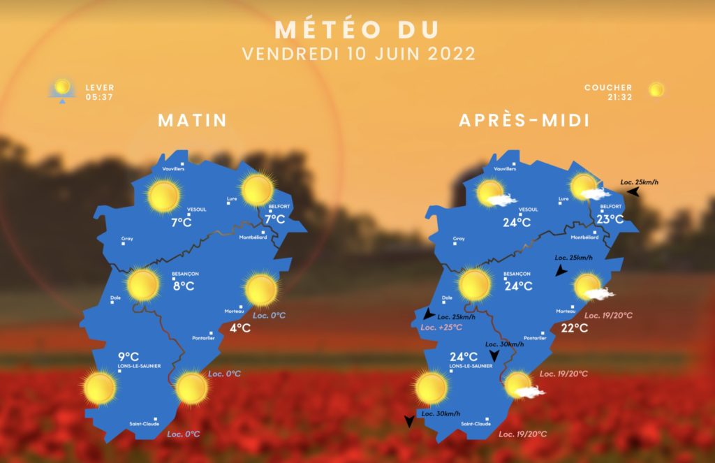 Dans la continuité, c’est le soleil qui dominera aux quatre coins de la Franche-Comté avec seulement quelques nuages et un vent de nord discret ici ou là (rien de dérageant).