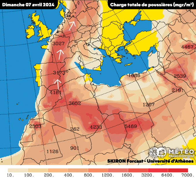 Modélisation de la quantités de sable (en mgr/m2) dans l’air ce dimanche.