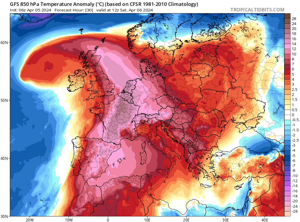 Une telle chaleur s’explique par le passage d’une dépression qui remonte vers Irlande et dresse un puissant courant de SUD entre le Maroc et la France… transportant un air chaud inédit en altitude avec une anomalie à 1500m d’altitude équivalente à +17 degrés ce samedi vers la mi-journée.