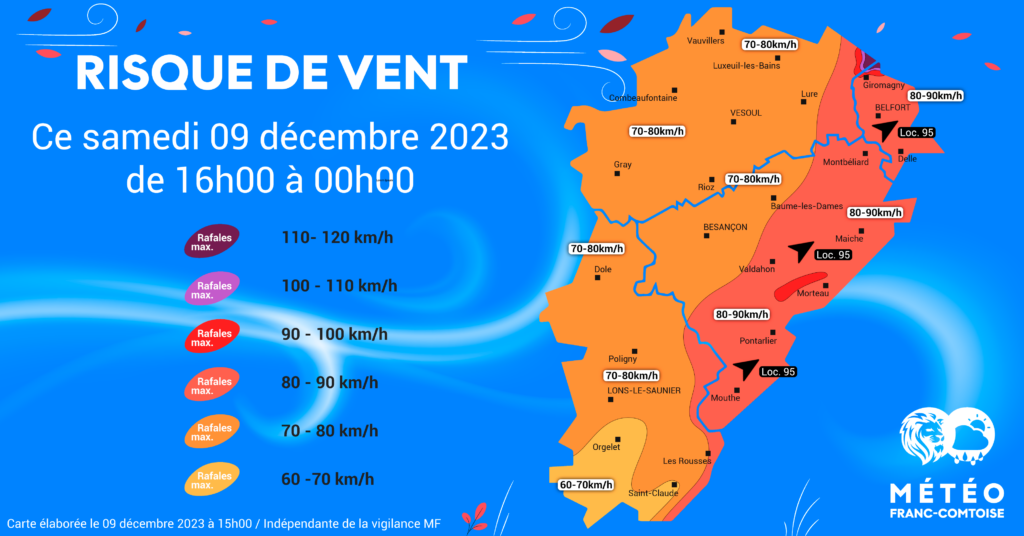 Durant le pic d’intensité du coup de vent — de 18h00 à 22h00 — des pointes à 90-95km/h peuvent même être observées localement du Haut-Doubs au Pays de Montbéliard et Territoire de Belfort voire éventuellement 100km/h sur les plateaux exposés (ou au-dessus de 1100 mètres d’altitude).
