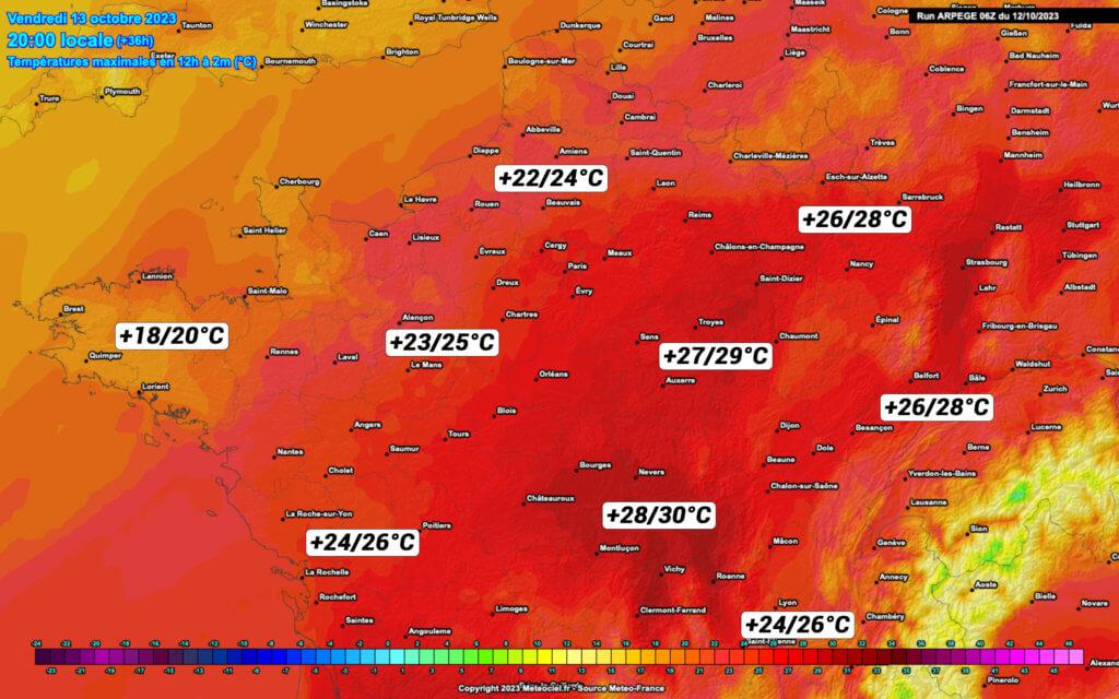 Les conditions estivales qui « prédominent » depuis plusieurs semaines se maintiennent le vendredi 13 octobre en Franche-Comté avec de très rares nuages, un vent de SUD-OUEST modéré (en rafales à 40-60km/h) et une chaleur exceptionnelle pour la saison.