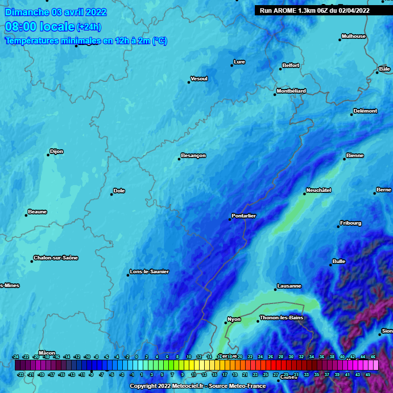 Ce Lundi 04 Avril entrera vraisemblablement dans les annales du climat franc-comtoise… Et pour cause : arrêt de la bise + dégagement du ciel vont provoquer un grand plongeon du thermomètre sous 0°C aux quatre coins de la Franche-Comté ! Voici les minimales prévues :