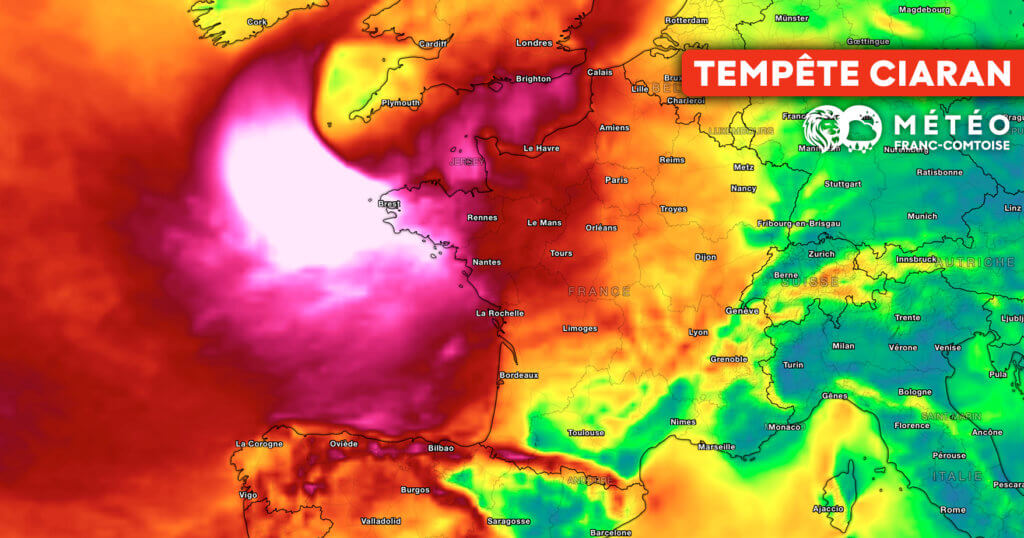 Comme évoqué le week-end dernier, plusieurs tempêtes vont circuler de l’Atlantique vers la France cette semaine à commencer par ce jeudi 02 novembre 2023 où Ciarán, une dépression exceptionnelle creuse — au coeur proche de 950 hPa — va s’engouffrer dans la Manche et balayer (dès mercredi soir) la Bretagne et la Normandie. Sur ces régions, des rafales de vent comprises entre 100 et 140km/h sont prévues avec des pointes à 150-170km/h sur les côtes où des vagues de 6 à 10 mètres seront observées !