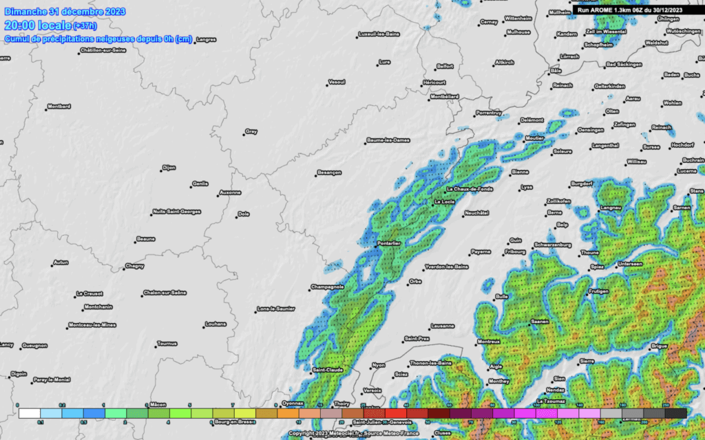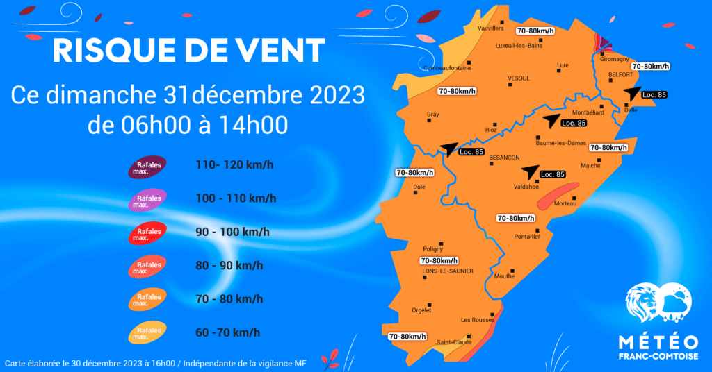 Comme annoncé dans le bulletin du jour, la tempête « Géraldine » qui balaie la Bretagne dans la nuit de samedi à dimanche apportera un front pluvieux actif dans la matinée du 31 décembre 2023 en Franche-Comté. Le vent de SUD à SUD-OUEST se lèvera vers 05/06h dans le Jura, vers 07/08h du Doubs à la Haute-Saône mais seulement vers 10/11h dans le secteur de Montbéliard-Belfort !