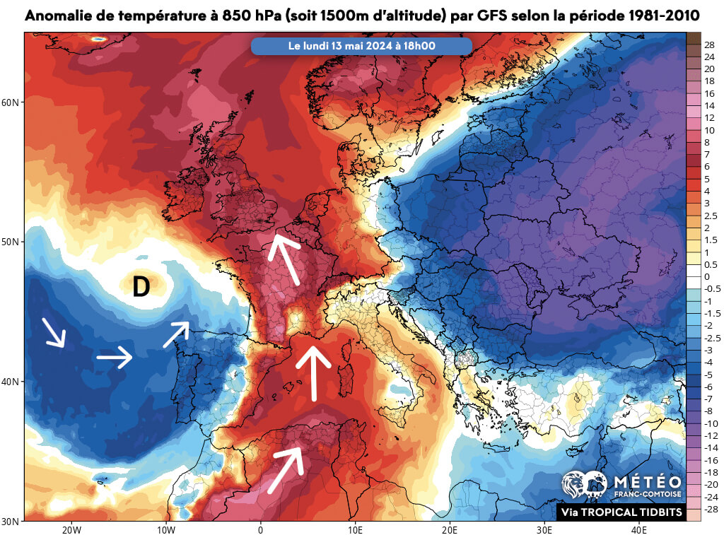 L’air chaud venu d’Espagne — apporté par une dépression isolée au large du Portugal — se maintiendra pour la reprise, le lundi 13 mai en Franche-Comté, avec toujours 20 à 25°C des hauteurs vers la plaine (un peu moins autour de 1100 mètres d’altitude).
