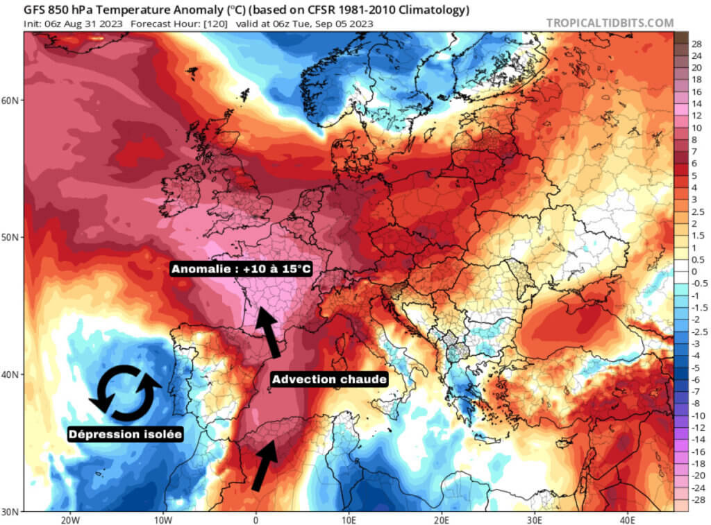 Anomalie de T° à 1500m, le 05 sept. par GFS