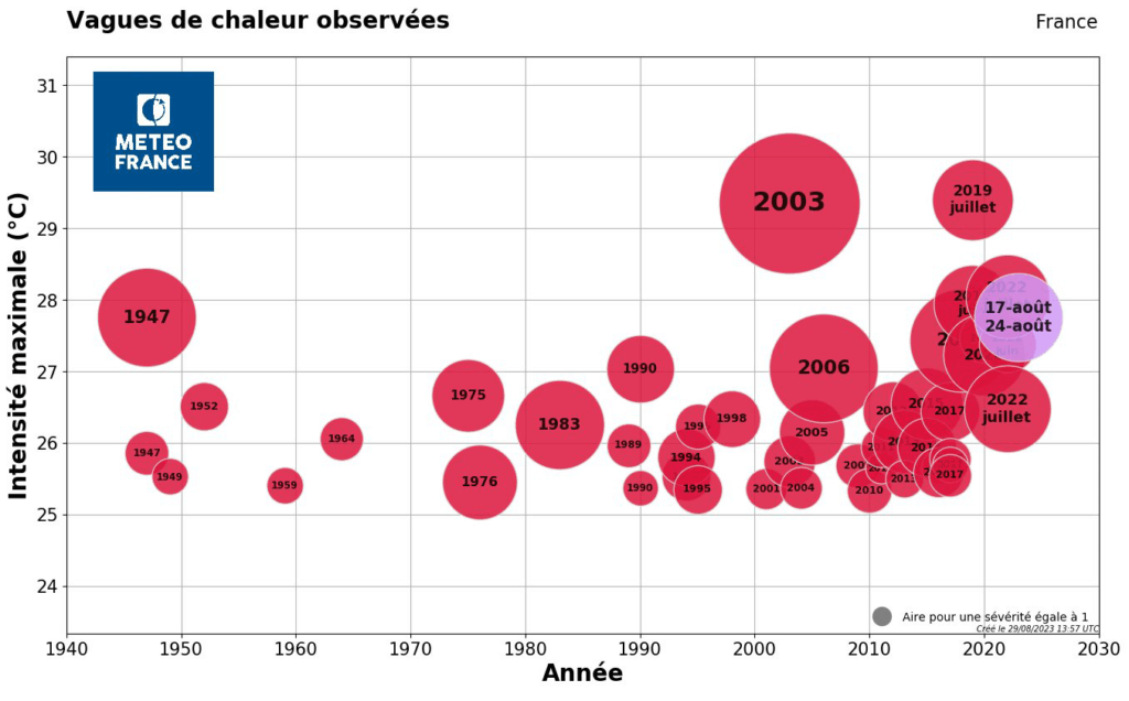 Pour rappel, le réchauffement climatique — en cours — rend plus probable et plus intense les vagues de chaleur estivales et/ou la douceur hivernale. Ainsi, il n’y a rien de surprenant à retrouver des traces de chaleur inédite en 1880. Ces phénomènes exceptionnels dans le passé deviennent cependant banals aujourd’hui, comme le démontre l’historique des vagues de chaleur depuis 1947 :