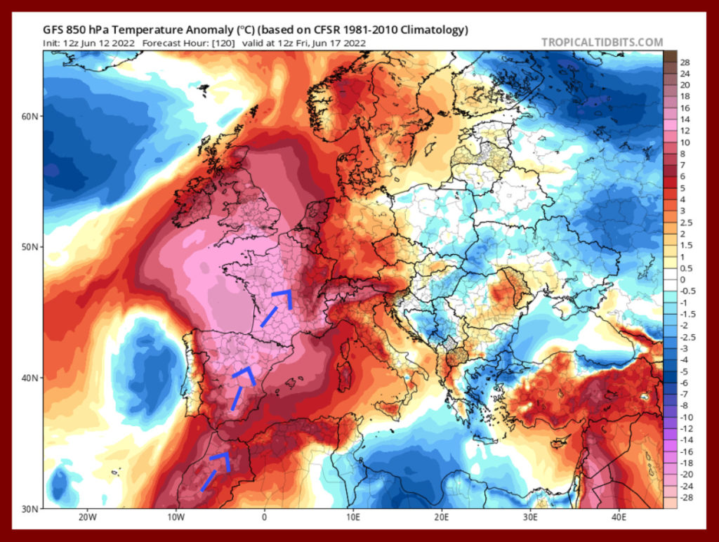 En image – L’arrivée de l’air chaud vendredi avec ici, l’anomalie de T° à 1500m d’altitude.