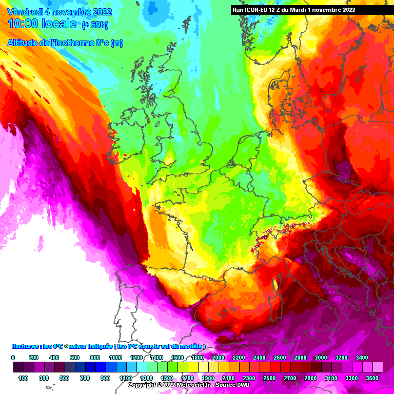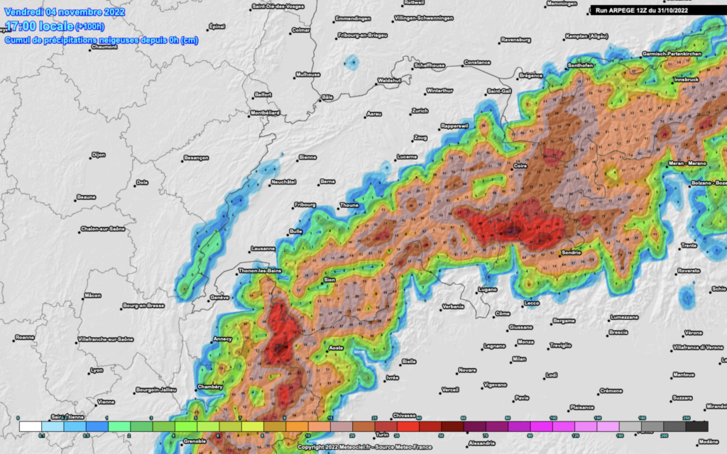 En effet, les précipitations insuffisantes et la température ne permettront pas aux flocons d’accrocher le sol en dessous de 1.300 mètres d’altitude. On peut toutefois s’attendre à un saupoudrage blanc près des sommets (au dessus de 1.400m) comme le démontre la simulation — pour vendredi soir — du modèle ARPEGE de Météo-France.