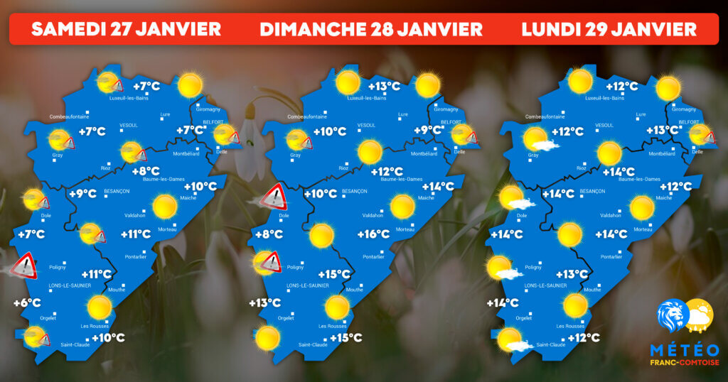 Les friands de froid, de neige ou de ski vont être déçus… puisque l’air doux va nous accompagner toute la semaine jusqu’au 04 février 2024 (au moins) en Franche-Comté avec des journées comprises entre +10 et +14°C en plaine ou entre +8 et +12°C en montagne (sans exception). Pas ou peu de gelées nocturnes… et un ciel partagé entre soleil ou périodes nuageuses !