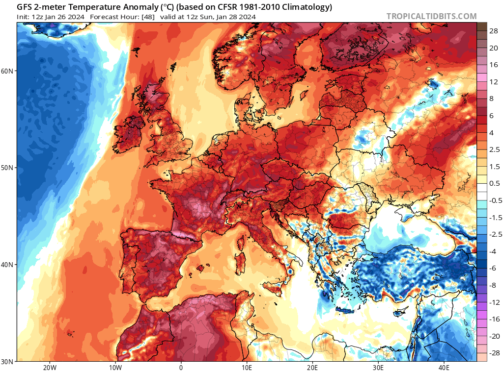Modélisation (GFS) de l’anomalie saisissante d’environ +10 degrés, dimanche 28 janvier