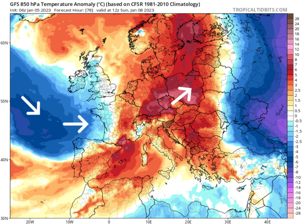 Cet air frais nous parviendra directement du Nord de l’Atlantique et chassera l’air (trop) doux présent depuis Noël (sur le pays et nos voisins) vers l’Europe centrale ou de l’Est.