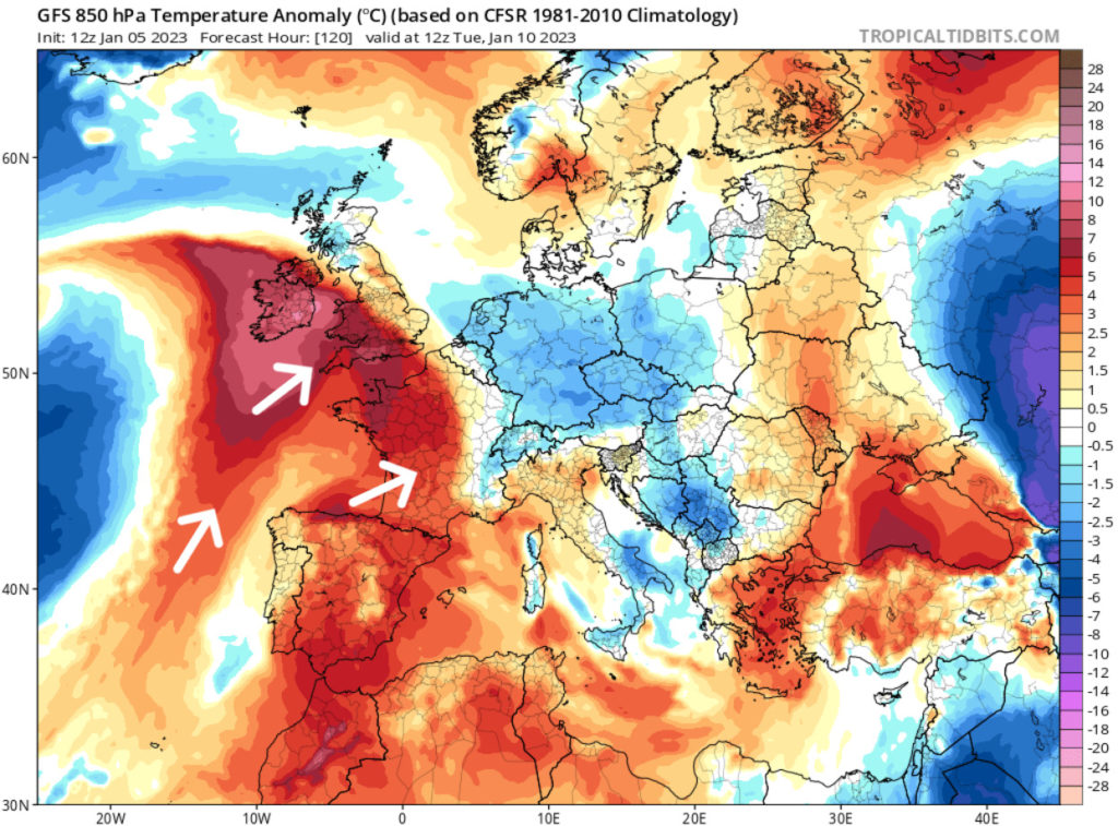 Modélisation GFS / Anomalie de température prévue à 1500m en Europe ce mardi 10 janvier 2023 (12h00).