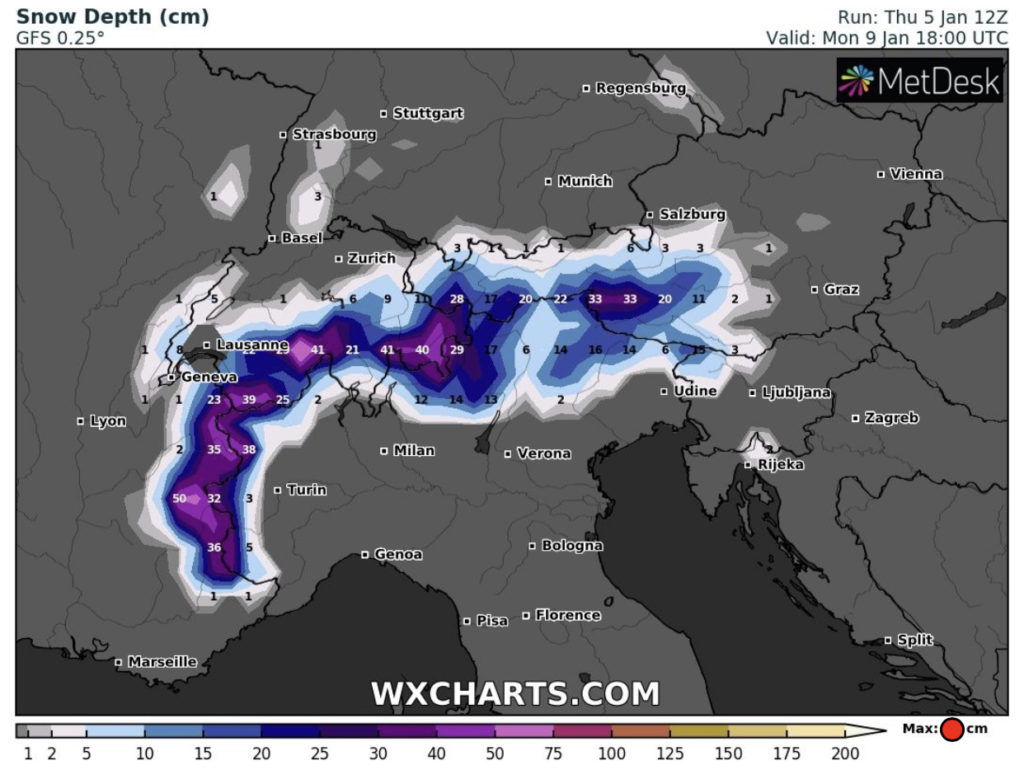 D’ici mardi matin, les cumuls au sol pourraient évoluer entre 5 et 10cm vers 1300 mètres (plutôt un saupoudrage à 1000 mètres) mais il est impossible — 96 heures avant — de le certifier et c’est pourquoi nous en reparlerons.