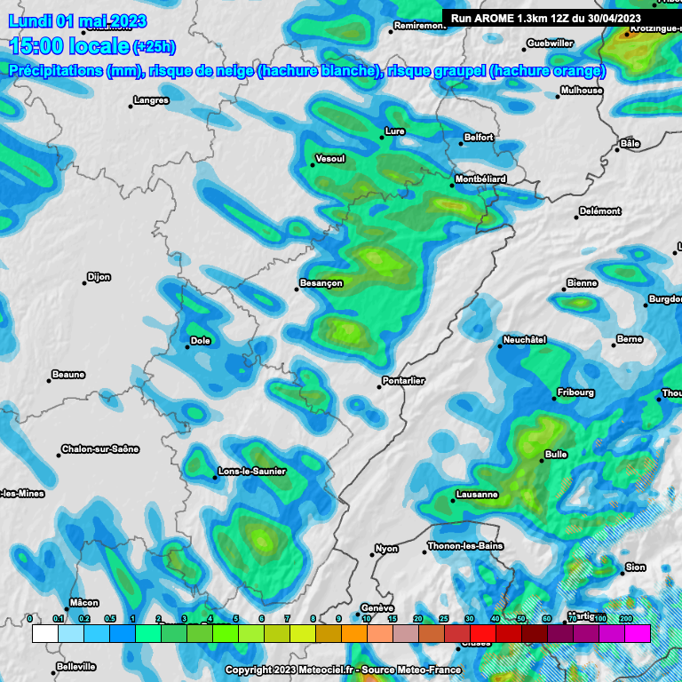 Des averses de pluie reviennent ce lundi 1er mai 2023 en Franche-Comté. Globalement assez rares en matinée, elles s’annoncent plus fréquentes en cours d’après-midi et en soirée avec la possibilité de coups de tonnerre isolés ainsi que de grésil.