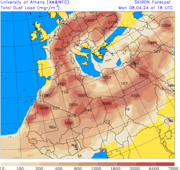 Quantités de sable (en mgr/m2) dans l’air lundi prochain