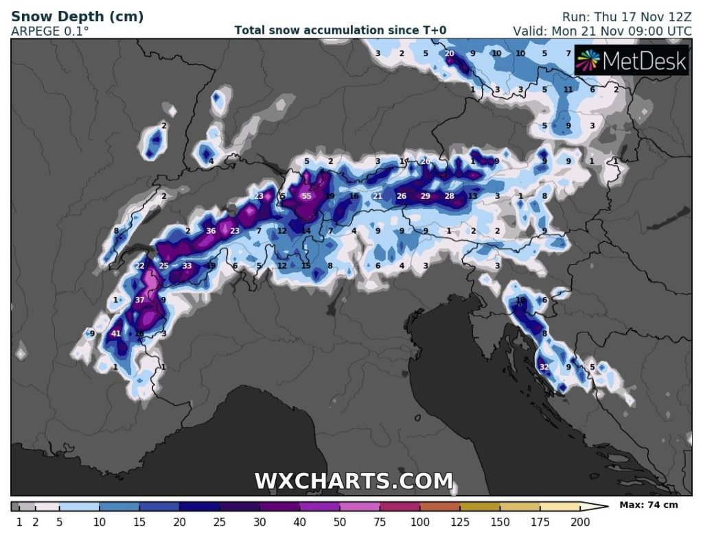 Ainsi, la soirée de dimanche mais également la nuit suivante seront hivernales puis cette perturbation s’évacuera au lever du jour le lundi 21 novembre en direction de la Suisse.