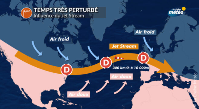 Cette véritable autoroute aérienne de haute altitude joue un rôle DÉTERMINANT dans la configuration de notre météo. Agissant comme un régulateur, le jet stream sépare les masses d’air froid des masses d’air chaud et influence directement la formation, la trajectoire et l’intensité des dépressions.