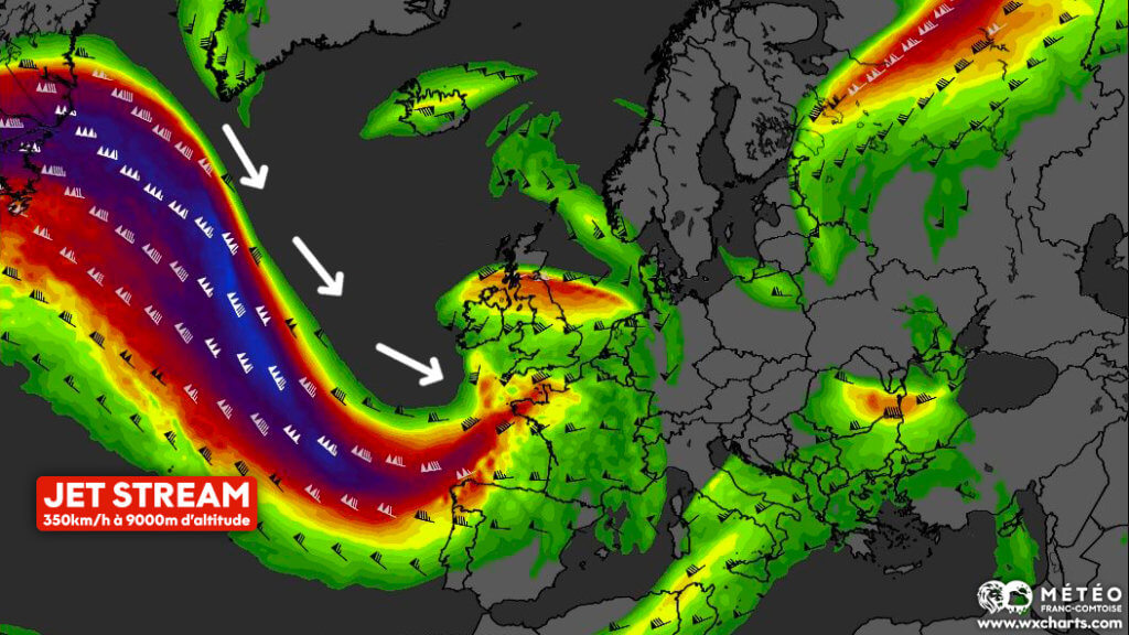 Dans le même temps, un puissant jet stream s’organisera au-dessus de l’Atlantique avec des vents qui atteindront environ 350km/h dès mercredi à 9.000 mètres d’altitude.