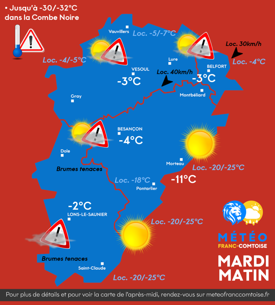 🔹 Dans le Haut-Doubs et dans le Haut-Jura, c’est même un froid glacial/polaire qui est prévu avec -10 à -25°C. Le pic de froid est prévu ce Mardi matin sur les hauteurs, et il est même envisagé -30 à -32°C dans la Combe Noire de Mignovillard (39) ! Puis Mercredi matin, les minimales devraient perdre 1 ou 2°C, tout en restant glaciales… Quant à Jeudi matin, il ne fera plus que -4/-8°C sur le premier et le second plateau, contre -12/-20°C dans les combes…