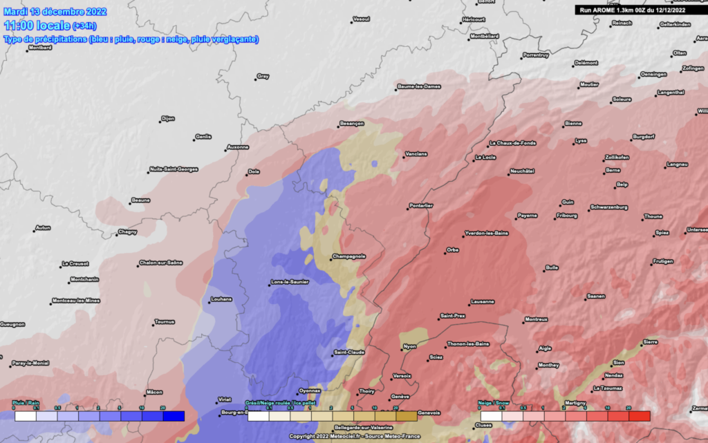 Modélisation MF – Type de précipitation ce Mardi 13 déc. à 11h00 (redoux par le Jura).