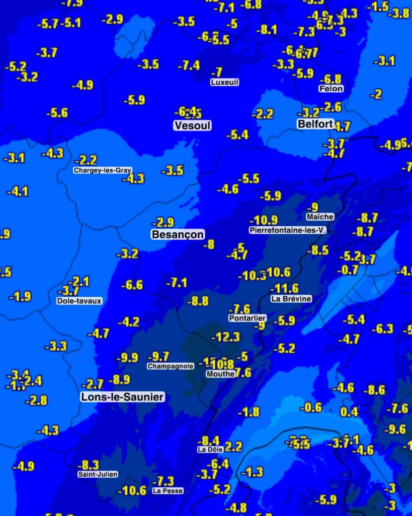 D’ici là, chaque nuit sera comprise entre -2 et -6°C en plaine de Franche-Comté… Contre -5 et localement -15°C dans le Haut-Doubs ainsi que le Haut-Jura !