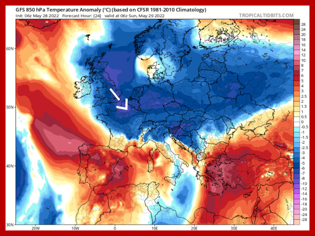 En image – L’anomalie de température à 1500m d’altitude, ce Dimanche 29 Mai :