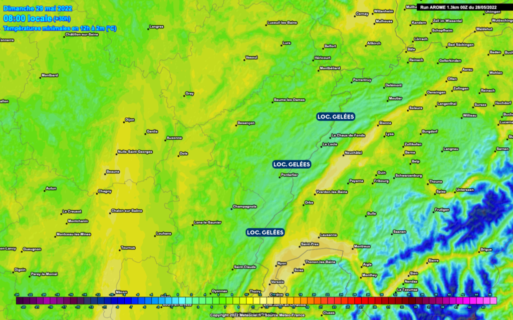 Un risque de gelées apparait bel et bien dans le Haut-Doubs et dans le Haut-Jura – pendant une ou deux heures au lever du jour – ce dimanche 29 et lundi 30… Les minimales au-dessus de 700m d’altitude pourront ainsi descendre entre +2 et -2°C isolément (les combes sont notamment exposées) !