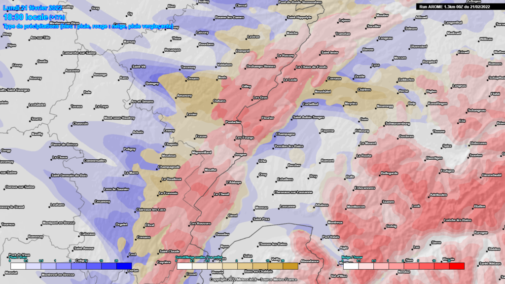 Puis en soirée / nuit, les précipitations accrochent sur le second plateau… Avec une limite pluie-neige qui s’établit autour de 800m (variation de 50 à 100m localement le soir). Ici aussi, les accumulations au-dessus de 1000m sont rapides.
