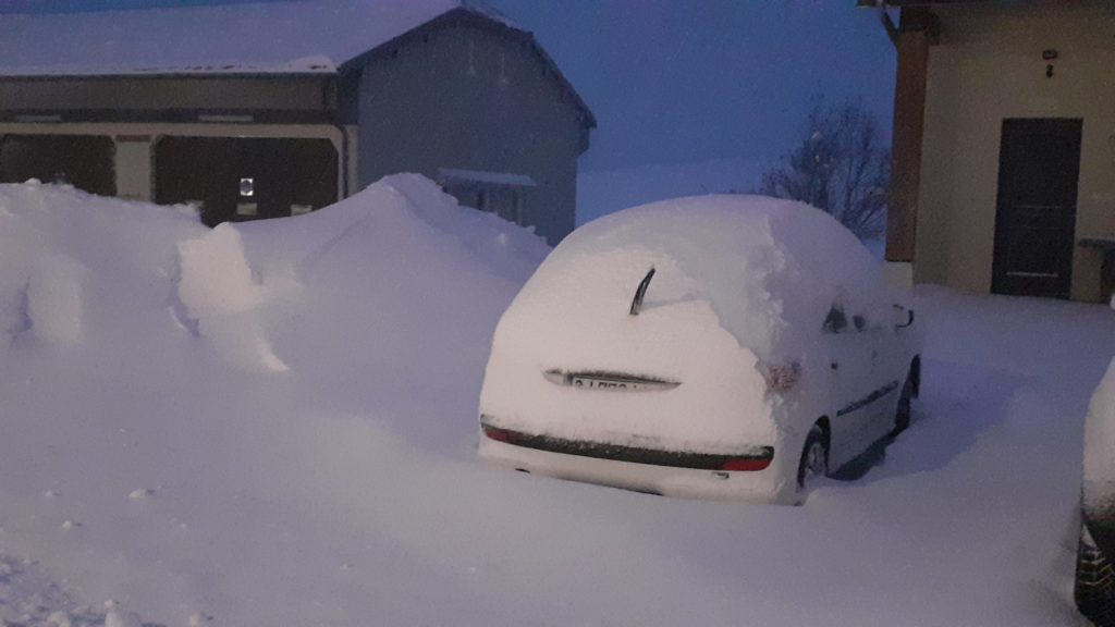 La tempête de neige* annoncée entre Samedi soir et ce Dimanche matin a bien eu lieu au-dessus de 1000m dans les Vosges, le Doubs et le Jura… Entre 20h et 06h, de fortes rafales ont traversé la Franche-Comté avec 80 à 120km/h en montagne ! Celles-ci ont provoqué de grosses congères (déplacement de la neige par l’action du vent), faisant disparaitre certaines routes…