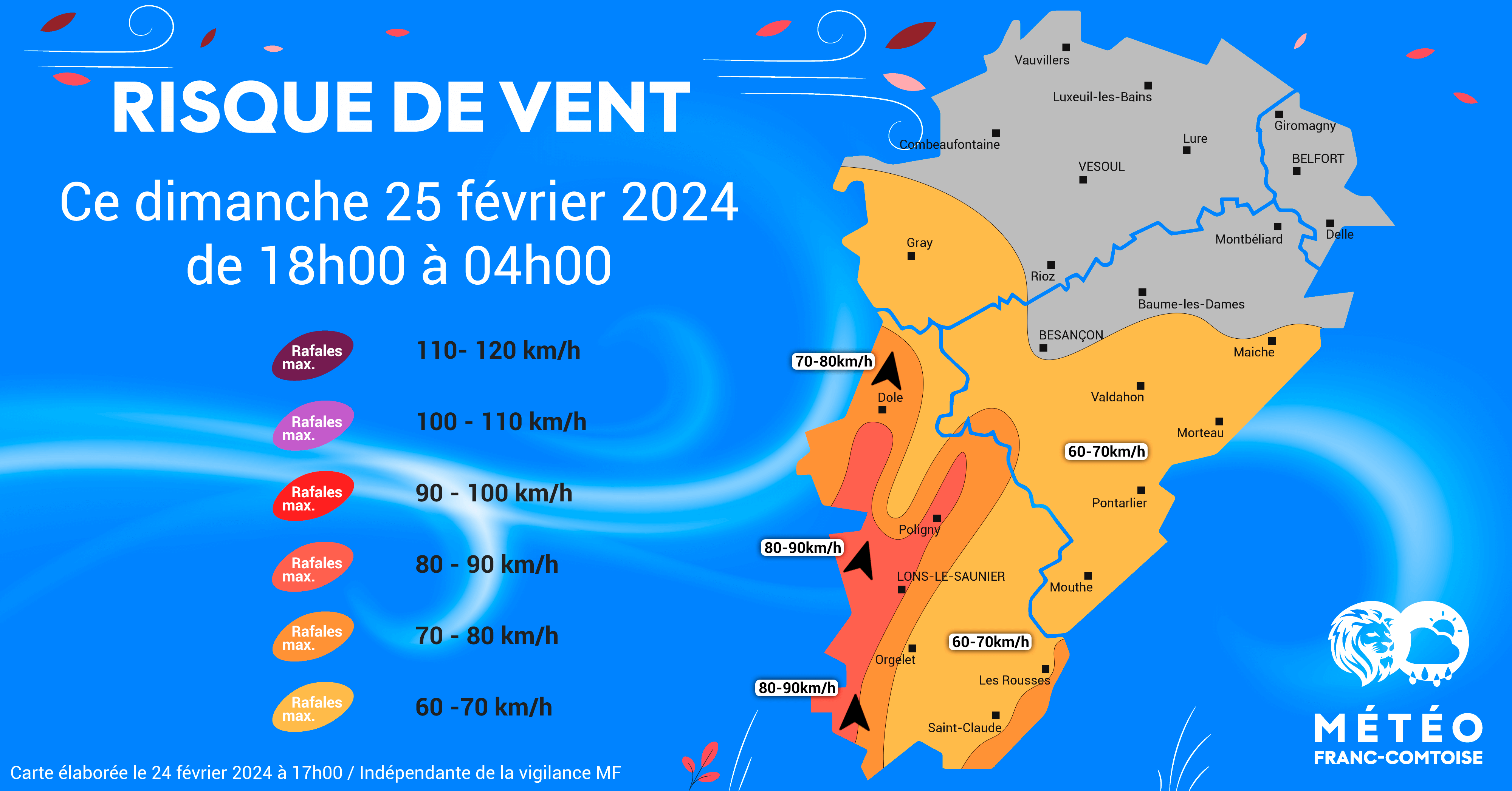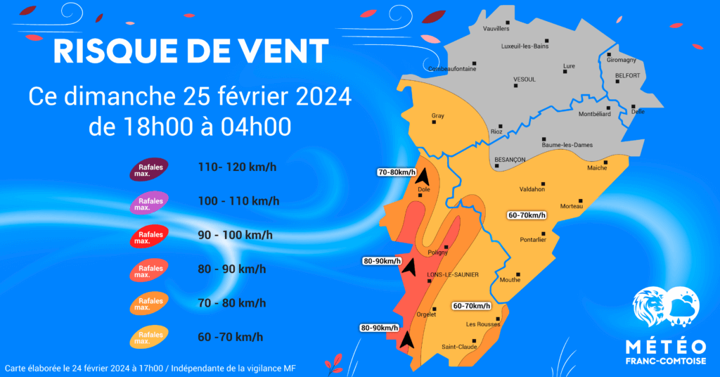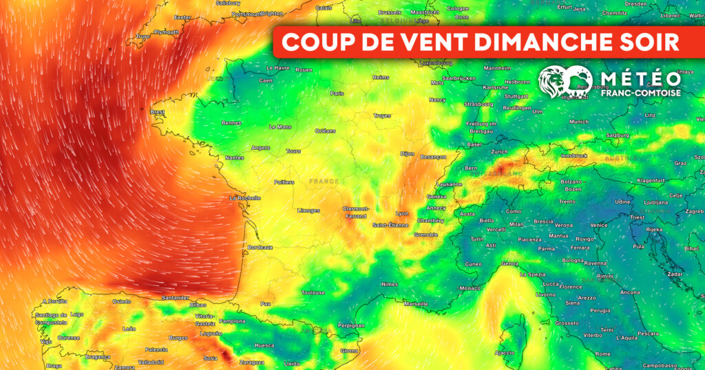 Après une journée rythmée par des éclaircies en Franche-Comté, les rafales de SUD (déjà) comprises entre 50 et 70km/h dimanche après-midi dans le Jura entreront dans le « pic d’intensité » à compter de 20h00… au moment de l’arrivée de passages pluvieux sur la région.