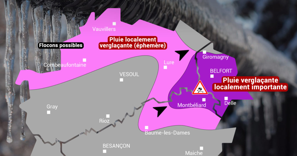 Dans le même temps, des précipitations se maintiendront en Franche-Comté et même jusqu’au lever du jour dans de moindres mesures — ce jeudi 15 décembre — au pied des Vosges. Avec l’air doux tenace en altitude, il s’agira de pluie et au contact de sols froids dans la zone définie, du verglas réapparaîtra.