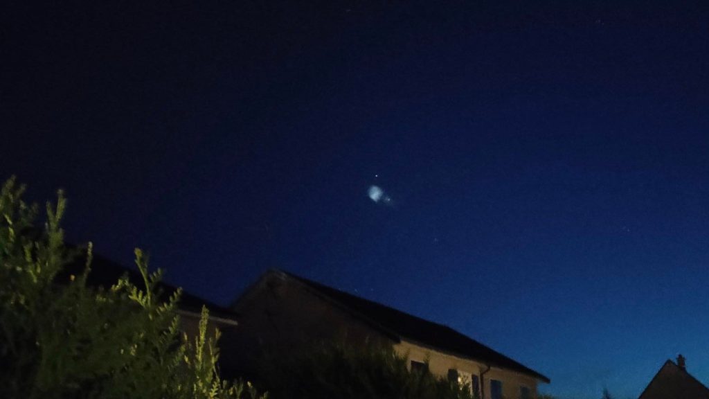 À 21h45, le second étage de Falcon 9 (SpaceX) voyageait à une vitesse de 27 800 km/h pour une altitude supérieure à 300 km. Pour éviter de laisser ce débris de plus de 10 mètres dans l’espace, le moteur a été rallumé quelques instants en crachant plusieurs tonnes de gaz… Créant un nuage pour le désorbiter !