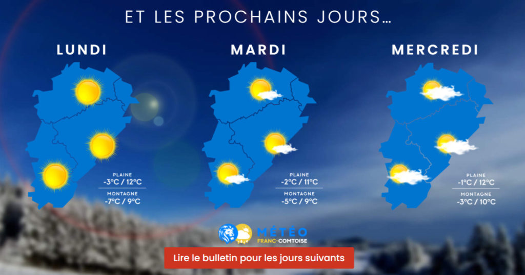 Ce Lundi de la rentrée scolaire s’annonce ensoleillé aux quatre coins de la Franche-Comté ! La bise disparaitra progressivement dans le Territoire de Belfort et le Pays de Lure (70)… Puis des nuages élevés décoreront le ciel Mardi après-midi (1er jour du mois de Mars) avant que des cumulus alternent avec de belles périodes ensoleillées dès Mercredi.