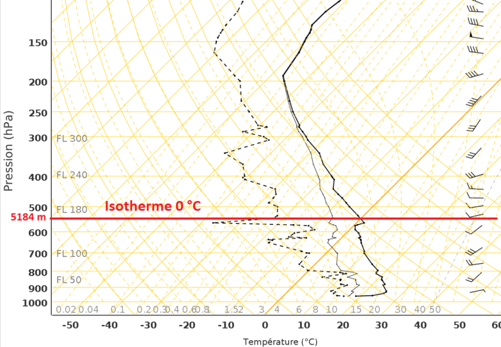 Il est minuit, lorsque le ballon-sonde est envoyé dans l’atmosphère pour effectuer ses mesures. Et après analyse des données en journée de lundi, MétéoSuisse annonce que l’isotherme du 0°C relevée cette nuit à 5184m d’altitude est désormais la plus élevée jamais observée en Suisse.