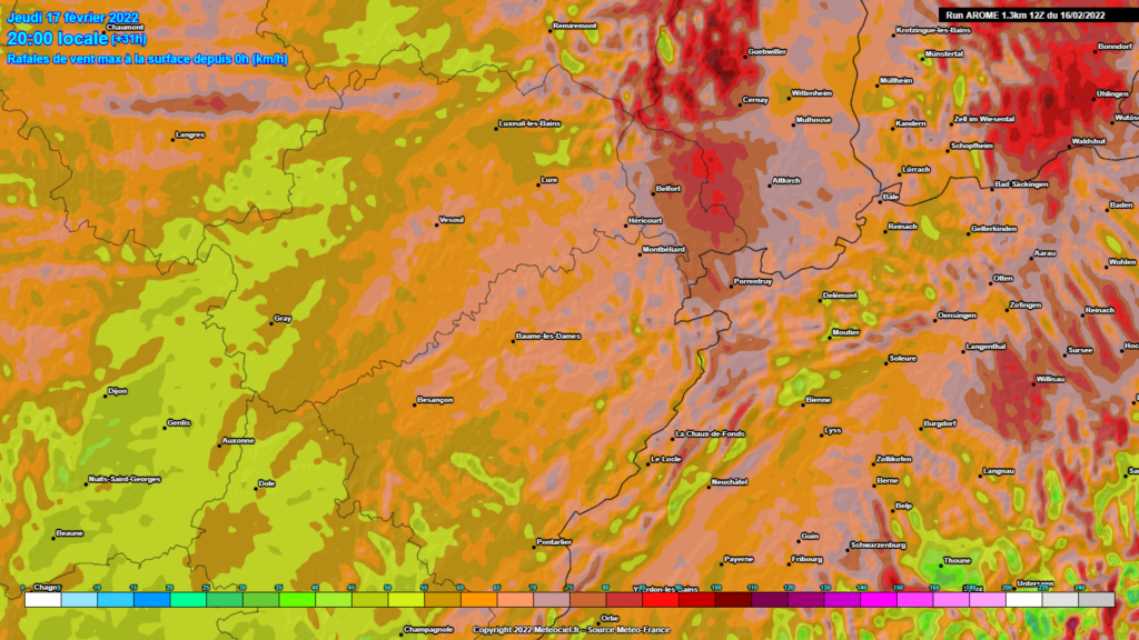 Nous relèverons déjà 65-80km/h dans le Territoire de Belfort et toujours 50 à 70km/h dans le Doubs et la Haute-Saône (ou 30 à 55km/h dans le Jura).