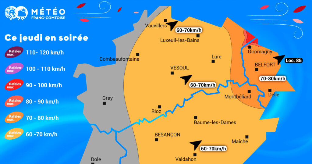 Si notre région reste en marge de la tempête, celle-ci va générer de bonnes rafales de secteur SUD-OUEST à 60-70km/h ce jeudi soir de la Haute-Saône au Doubs mais 70-80km/h dans le Territoire de Belfort et sa périphérie… voire 85km/h à proximité de l’Alsace (peut-être un peu plus près du Ballon d’Alsace).