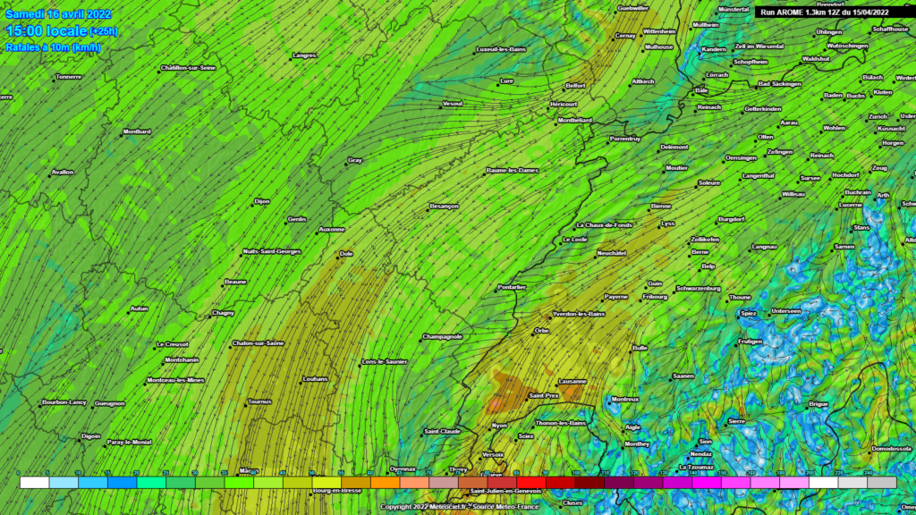 En image – La bise modélisée (par Arôme) ce Samedi après-midi entre Belfort et le Jura ! Le Sud-Ouest des Vosges (Lure et Luxeuil) est comme souvent bien abrité…